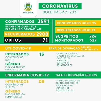 Boletim Covid deste sábado traz mais um recorde em Campo Mourão: 95 casos confirmados num único dia (só quando houve o surto na cadeia teve mais). Com isso, o número de mourãoenses com vírus ativo saltou para 612. Pra completar, foi confirmado o 71° óbito, um homem de 75 anos. A taxa de ocupação na UTI está em 83%.