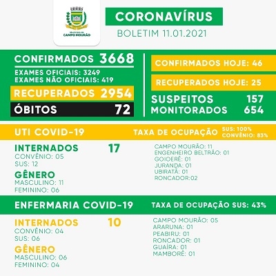 Boletim Covid desta segunda-feira trouxe a confirmação de mais 46 casos de covid-19 em Campo Mourão. O número de mourãoenses com o vírus ativo subiu para 642. Pior: foi confirmada a 72ª morte (mulher de 72 anos). Além disso, a UTI voltou a ficar lotada entre os leitos do SUS.