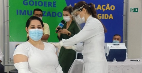Silézia Sandi Maronese, enfermeira da UTI da Santa Casa de Goioerê, após ser a primeira pessoa do município a ser vacinada contra a covid-19, nesta terça-feira à noite, em evento na Acig transmitido por live.