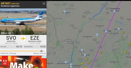 Os leitores de Boca Santa não deixam passar nada. Anderson Franciscon acompanhou pelo site Flightradar24 o avião carregado com vacina contra covid-19 que passou sobre Campo Mourão neste sábado. "Infelizmente só passou, o destino final é Buenos Aires", escreveu. "O voo originado de Moscou (Rússia) importa 300 mil doses da vacina Sputnik".