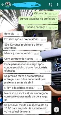 Segundo a denúncia, uma pessoas entra em contato dizendo que a pessoa foi selecionada via Jovem Aprendiz.
