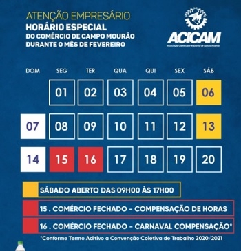 O comércio lojista de Campo Mourão abre até às 17h nos próximos dois sábados - dias 6 e 13 - mas vai fechar na segunda e terça-feira, dias 15 e 16. Tudo conforme acordo da convenção coletiva de trabalho. O fechamento no carnaval (mesmo sem carnaval devido à pandemia) é para compensar a abertura das lojas em horário especial em dezembro. O calendário para o mês está sendo divulgado pela Acicam.