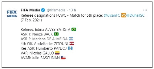 Ulsan Hyundai (Coreia do Sul) e Duhail (Catar) jogam neste domingo (12h) valendo o quinto lugar no Mundial de Clubes que está sendo disputado no Catar. E o que é que a gente tem a ver com isso? Tem que a árbitra da partida será a goioerense Edna Alves. Isso é histórico. Pela primeira vez que uma mulher vai apitar um jogo de mundial masculino. E essa mulher é de Goioerê.