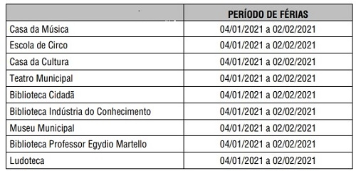 Não procure os setores de atendimento da Fundação Cultural de Campo Mourão em janeiro. Decreto que saiu no fim de semana prevê férias coletivas e 4 de janeiro a 2 de fevereiro. Para tudo (veja quadro acima). Ou melhor, quase tudo. Só haverá expediente nos departamentos administrativo e financeiro.
