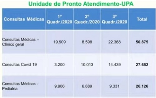 Quadro apresentado em audiência pública da Saúde mostra o comportamento do público de Campo Mourão diante da apandemia. O número de consultas na UPA caiu de 19,9 mil no primeiro quadrimestre para 8,5 mil no segundo. Já no terceiro subiu para 22,3 mil, totalizando 50,8 mil no ano. A queda no período de maio a agosto é atribuída ao "medo da covid-19" que, como dá pra ver, parece que passou...