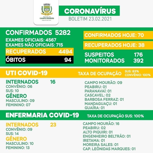Campo Mourão teve mais 70 casos de covid-19 confirmados nesta terça-feira. Número bem acima da média. Os suspeitos aumentaram para 176. A ala covid da Santa Casa está com todos os leitos da enfermaria ocupados. Na UTI, a ocupação segue em 100% nos leitos de convênio e subiu para 83% entre os do SUS.