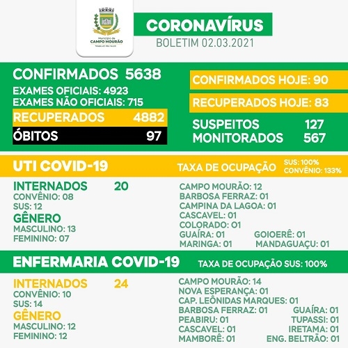 Mais duas pessoas morrerm de covid-19 nesta terça-feira em Campo Mourão. Foram uma mulher de 81 e outra de 83 anos. O boletim confirmou mais 90 casos da doença. Índice de ocupação na ala covid da Santa Casa: 100% na UTI SUS, 133% na UTI Convênios e 100% na enfermaria. De positivo, a queda no número de suspeitos para 127.