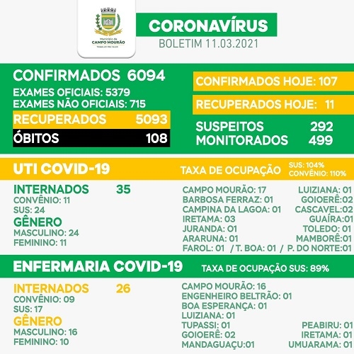 Campo Mourão bateu novo recorde de casos confirmados de covid-19 num só dia: 107 nesta quinta-feira. Com isso, o número de mourãoenses com o vírus ativo foi a 893, outro recorde. E recorde também no número de pessoas na UTI: 35. A taxa de ocupação de leitos ficou em 104% no SUS e 110% nos convênios.