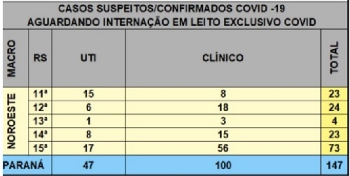 Às 12h deste sábado havia 15 pessoas a espera de vagas em UTIs Covid apenas na região de Campo Mourão. Outras oito necessitavam de enfermaria. Isso somente entre os 25 municípios da 11ª Regional de Saúde. Na chamda Macro Noroeste a fila era de 47 pessoas para a UTI e 100 para enfermaria.
