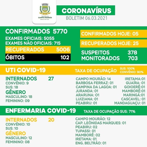 Foram habilitados seis novos leitos do SUS na UTI Covid da Santa Casa de Campo Mourão. Erm 12 e agora são 18. Só que todos já estão ocupados. Ao todo, são 27 pessoas na UTI - 18 pelo SUS e nove por convênios. O boletim deste sábado também confirma mais um óbito (o 102° - homem de 52 anos) e mais cinco novos casos (poucos porque o Lacen não está dando conta de fazer tantos exames).