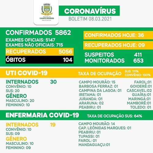 Mais dois homens - um de 51 e outro de 75 anos - morreram em decorrência da covid-19, nesta segunda-feira, em Campo Mourão. São nove óbitos em oito dias de março. O boletim covid também mostra a UTI superlotada com 30 pacientes - 20 pelo SUS (111% de ocupação) e 10 por convênios (100%). Os novos casos confirmados foram 36, mas o número de suspeitos saltou para 411.