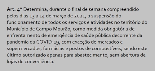 É o que prevê novo decreto de Goioerê para sábado e domingo próximos. O próprio prefeito Betinho Lima fez o anúncio nesta terça-feira. Fora isso, no entanto, as medidas são mais brandas que as de Campo Mourão. O comércio goioerense reabre neste quarta-feira das 8h às 18h e o toque de recolher será um pouco mais curto - das 22h às 5h. No fim de semana, igrejas poderão abrir com 50% da capacidade de público.