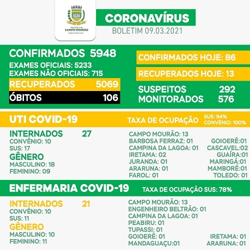 Mais 86 casos de covid-19 foram confirmados nesta terça-feira em Campo Mourão. São 773 mourãoenses com o vírus ativo. Houve mais duas mortes (agora são 11 somente este mês). O índice de ocupação na UTI SUS caiu para 94% (há 17 internados e 18 leitos). Os casos suspeitos também caíram (292).