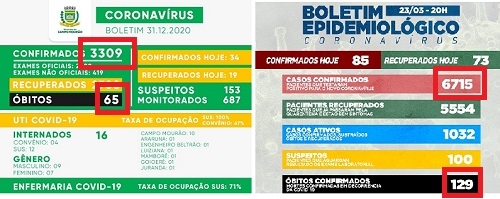 Boletim desta quarta-feira traz a confirmação da 130.a morte por covid-19 em Campo Mourão. Homem de 88 anos morreu em casa no final de fevereiro, mas o resultado do exame só saiu agora. Com isso, são 65 óbitos este ano, o mesmo número do ano passado inteiro. O dia teve mais 53 casos confirmados e a ala covid segue lotada - 84% na enfermaria, 108% na UTI SUS e 110% na UTI convênio.