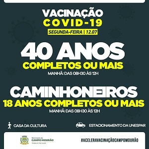 Atenção quarentões de Campo Mourão! A Secretaria de Saúde vai aplicar nesta segunda-feira a vacina contra a covid-19 para moradores do município com 40 anos. Será só pela manhã, das 8h30 às 12h, na Casa da Cultura e Unespar (drive Thru). Caminhoneiros com 18 anos ou mais também serão vacinados de segunda a segunda-feira das 8h30 às 12h.