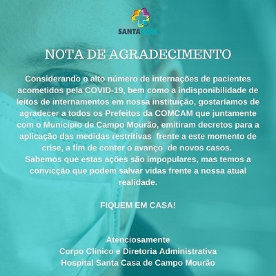 A Santa Casa de Campo Mourão divulgou nesta terça-feira nota de agradecimento aos prefeitos da região.