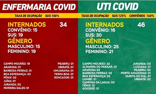 Campo Mourão encerrou maio com 80 pessoas internadas na ala covid dos hospitais. A taxa de ocupação de leitos ficou em 100% na enfermaria, 125% na UTI SUS e 160% na UTI convênios (recorde).
