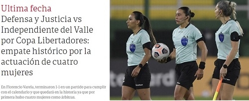 Defensa y Justicia (Argentina) e Independiente del Valle (Equador) empataram em 1 a 1 nesta quinta-feira pela Libertadores. O jogo entrou para a história por ser o primeiro da competição que teve todo o quadro de arbitragem feminino. No comando do quarteto, ela, Edna Alves, de Goioerê. A imprensa argentina, onde foi disputada a partida, deu o maior destaque, como o jornal "Clarin" (acima), por exemplo.