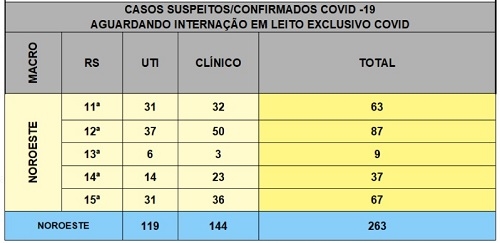 A fila por vagas em hospitais para pacientes com covid-19 continua na região. Na manhã desta quarta-feira havia 63 pessoas à espera nos 25 municípios da 11.a Regional de Saúde. Trinta e uma precisavam de UTI e 32 de atendimento clínico. Em toda a Macronoroeste a fila era de 263 pacientes, com 119 necessitanto de unidade de terapia intensiva.