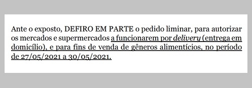 A liminar também autoriza os mercados a funcionarem pelo sistema delivery.