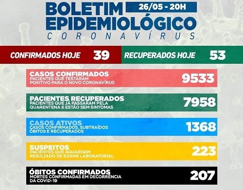 Campo Mourão teve mais 39 casos de covid-19 confirmados nesta quarta-feira. Também foi confirmada mais uma morte, a de número 39 em maio. Na ala covid dos hospitais, são 82 as internações, com o novo recorde de 45 na unidade de terapia intensiva (19 mourãoenses). Taxa de ocupação de leitos: 131% na enfermaria, 129% na UTI SUS e 150% na UTI convênios.