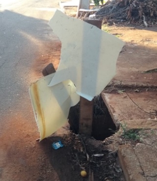"Placa improvisada indica boca de lobo aberta, na rua Damasco, conjunto Montes Claros".
