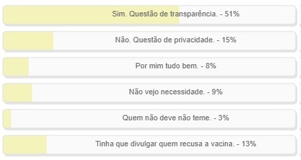 "Você concorda com a divulgação da lista de quem já foi vacinado contra a covid-19?" Enquete com essa pergunta foi encerrada neste domingo. "Sim. Questão de transparência" venceu, com 51% dos votos. "Não. questão de privacidade" teve 15%. Já para 13%, "Tinha que divulgar quem recusa a vacina". O resultado completo está no quadro acima.