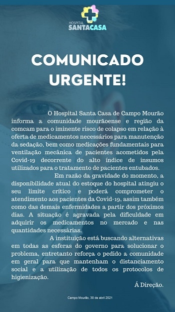 A Santa Casa de Campo Mourão está perto do colapso com a falta de remédios para tratamento da covid-19.