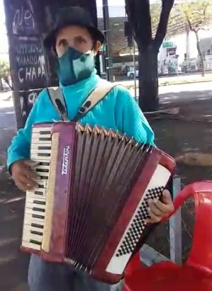 Todo mundo já viu malabarista se apresentando em semáforo, né? E sanfoneiro? Pois saiba que em Campo Mourão tem. Sebastião Correia dos Santos mostra sua habilidade com a sanfona aos motoristas que param no semáforo na av. Miguel Luiz Pereira, na entrada do Lar Paraná. Ele mora no jardim Santa Cruz e iniciou a apresentação de rua porque está desempregado.