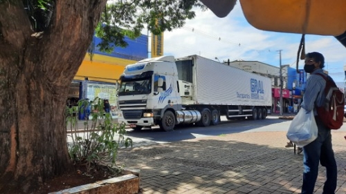 Carreta passa pela av. Capitão Índio Bandeira, em trecho do calçadão de Campo Mourão.