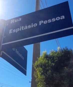Placa de sinalização de rua com erro em Ubiratã. Epitácio virou "Espitásio". Em tempo: Epitácio Pessoa foi presidente do Brasil de 1919 a 1922. Venceu Rui Barbosa na eleição.