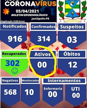 Janiópolis é, nesta terça-feira, a única cidade da região sem o vírus ativo da covid-19. Dos 314 casos confirmados no município, 302 se recuperaram e 12 morreram. Corumbataí do Sul tem um caso ativo. Na outra ponta estão Campo Mourão, com 664, e Terra Boa, com 123.