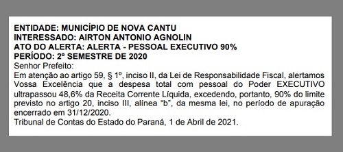 A publicação do Tribunal de Contas do Estado saiu nesta terça-feira. O município encerrou 2020 comprometendo acima de 48,6% da receita corrente líquida com a folha de pagamento. Não estourou os 54% do limite da Lei de Responsabilidade Fiscal, mas o TC já avisa para a administração ficar de olho nisso...