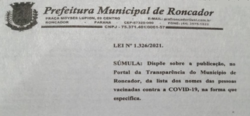 O prefeito de Roncador, Vivaldo Lessa, sancionou a lei que prevê a publicação do nome dos vacinados contra a covid-19.