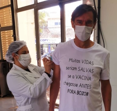 O empresário Ater Cristófoli foi vacinado contra a covid-19 neste sábado em Campo Mourão. Ele tem 56 anos. Aproveitou o momento para manifestar indignação através de mensagem na camiseta que vestia. "Muitas vidas seriam salvas se a vacina chegasse antes. Fora Bozo!!!"
