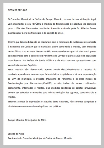 O Conselho de Saúde de Campo Mourão repudiou a decisão da prefeitura de liberar restaurantes até às 23h do último sábado.