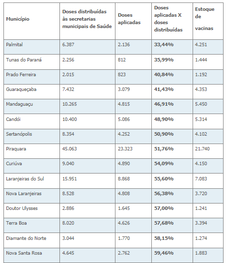 Dezesses municípios do Estado aplicaram menos de 60% das doses recebidas.