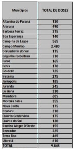 A 11ª Regional de Saúde vai distrituir nesta terça-feira mais 10.415 doses de vacina contra a covid-19 para os 25 municipios da região. São 9.845 da AstraZeneca (quadro acima) e 570 da Coronavac. Campo Mourão fica com 2.480 e 150, respectivamente. No sábado foram distribuídas 3.714 doses da Pfizer para quatro cidades, sendo 1.982 para Campo Mourão, 552 para Goioerê, 408 para Ubiratã e 342 para Terra Boa.