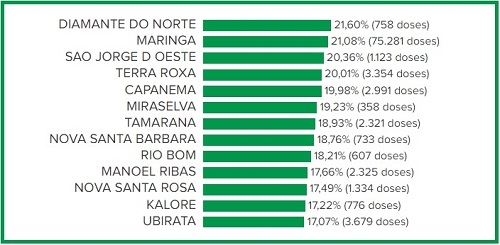 Ubiratã passou a ser a cidade da região que tem o maior percentual da população já vacinada com as duas doses contra a covid-19 (13° no Estado). O município tem 17,07% dos moradores imunizados (com a primeira dose são 48,19%). Campo Mourão está em 10° na Comcam, com 12,49%. A média do Paraná é 12,43%. Diamante do Norte lidera no Estado, com 21,60%. Campo do Tenente é o lanterninha (6,09%).