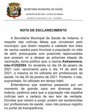 A prefeitura de Iretama descartou a possibilidade de ter aplicado vacina vencida contra covid-19.