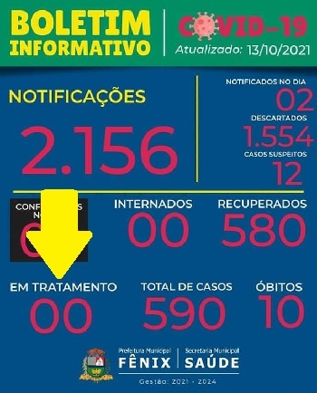 Não há casos ativos de covid-19, no momento, em Fênix. É o que nostra o boletim divulgado nesta quarta-feira pela Secretaria Municipal de Saúde. O município já teve 590 casos confirmados desde o início da pandemia, com 580 recuperados e 10 mortes. Também estão zerados, na região, Altamira do Paraná e Rancho Alegre do Oeste (esta última há mais de um mês).