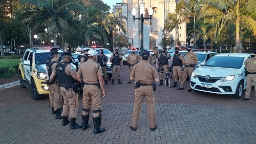 Policiais militares e viaturas da PM na praça São José, no centro de Campo Mourão, na tarde desta sexta-feira. Foi o lançamento da Operação Fecha Quartel 3. Funciona assim: o pessoal que fica no administrativo deixa seus postos e se junta que policiais que já estão nas ruas para intensificar os trabalhos. O objetivo é elevar a sensação de segurança da população.