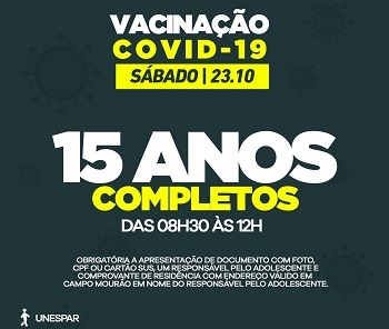 Adolescentes de 15 anos, de Campo Mourão, serão vaciandos contra a covid-19 neste sábado.