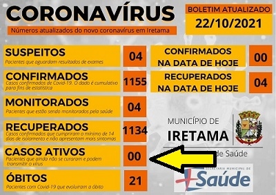 Iretama é o novo município da região sem casos ativos de covid-19. Apareceu "zerado" no boletim desta sexta-feira. A cidade já teve 1.155 casos confirmados desde o início pandemia - 1.134 se recuperaram e 21 morreram. Também estão sem casos ativos, na região, Altamira do Paraná, Boa Esperança, Nova Cantu, Quarto Centenário e Rancho Alegre do Oeste.