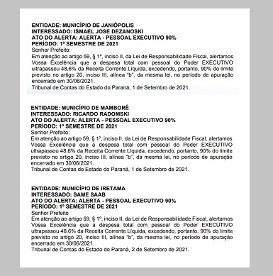 O Tribunal de Contas do Estado publicou nesta quinta-feira alertas para 14 prefeituras do Paraná.