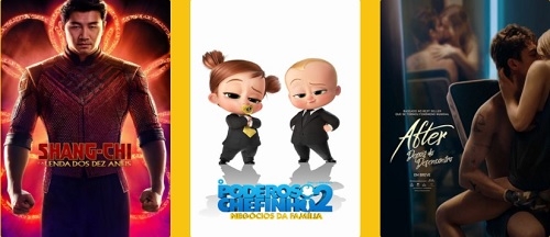 Três filmes seguem em cartaz no Cinemaxs, em Campo Mourão. "Shang-Chi - A Lenda dos Deus Anéis" tem sessões às 19h e 21h30, com sessão extra às 16h no sábado e domingo. A animação "O Poderoso Chefinho 2" é exibida às 19h, com sessão também às 16h30 no sábado e domingo. Já às 21h10 o filme é "After - Depois do Desencontro".