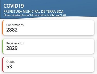 Segundo município da região em número de casos de covid-19, Terra Boa está sem nenhum caso ativo da doença. É o quarto município "zerado" na região. Terra Boa já teve 2.882 registros desde o início da pandemia, com 2.829 recuperados e 53 mortes. Na região, só Campo Mourão teve mais confirmações. Também estão "zerados" Boa Esperança, Moreira Sales e Rancho Alegre do Oeste.