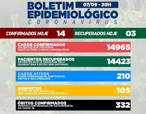 Campo Mourão confirmou mais 14 casos de covid-10 neste feriado de 7 de setembro. Os recuperados foram três e os casos ativos voltaram a passar de 200 (210). A taxa de internação na ala covid ficou em 47% na enfermaria, 41% na UTI SUS e 0% na UTI convênios.