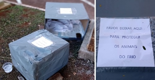 Caixas deixadas na praça São José, no centro de Campo Mourão. Todas forradas com panos. Do lado de fora, recipientes com água e ração. Em cima, o recado: "Favor deixar aqui para proteger os animais do frio". Durante a semana, segundo o Simepar, a tempetura míníma chegou a -3,1 graus na cidade.