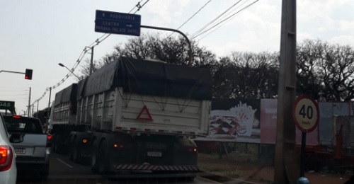Semáforo da av. Irmãos Pereira com a rodovia BR-487. Esta carreta está parada desde terça-feira.